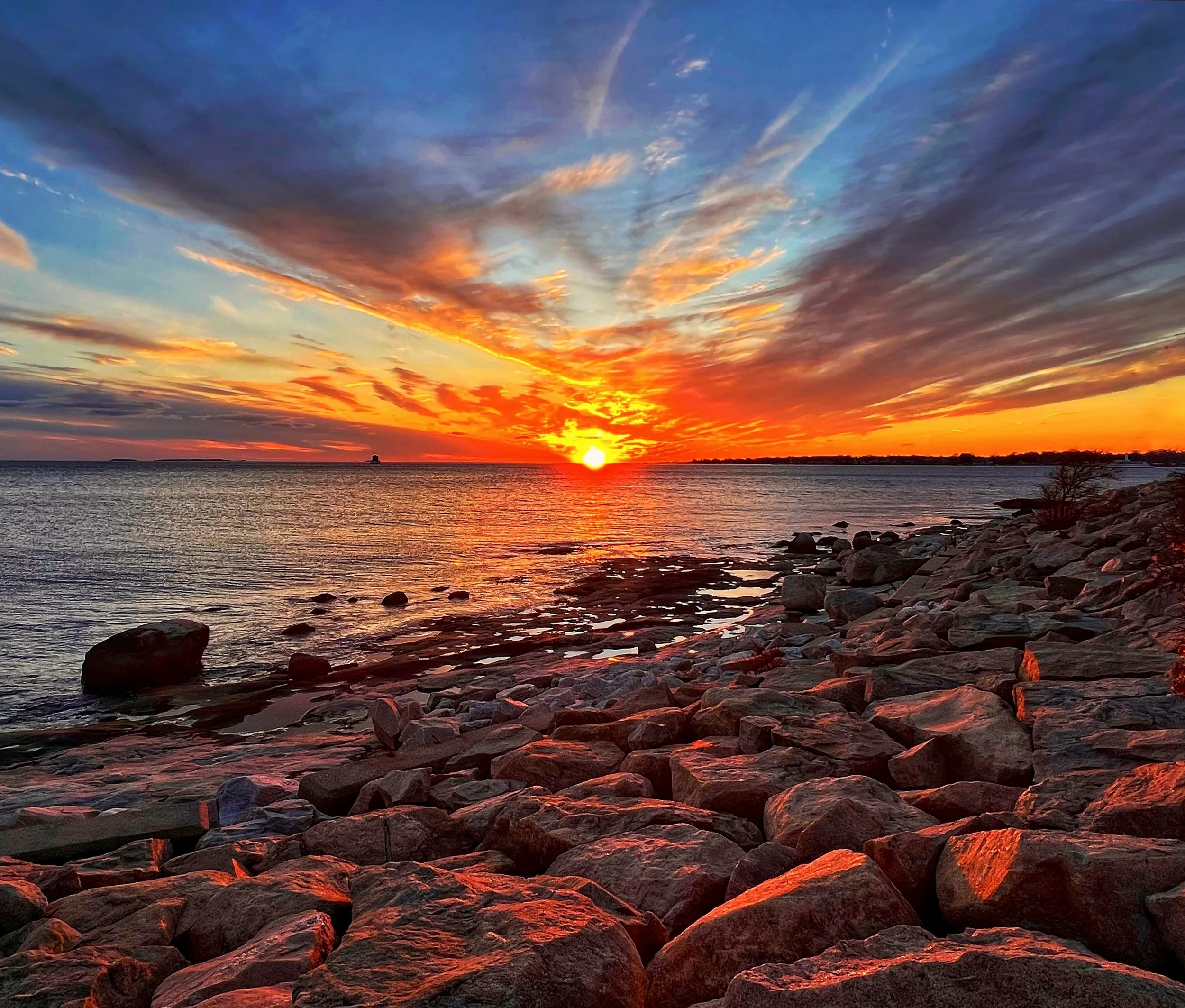 Just a few steps away from Avery Point Light, you’ll see spectacular coastal sunsets over the rocky shore looking out to New London Ledge Light.