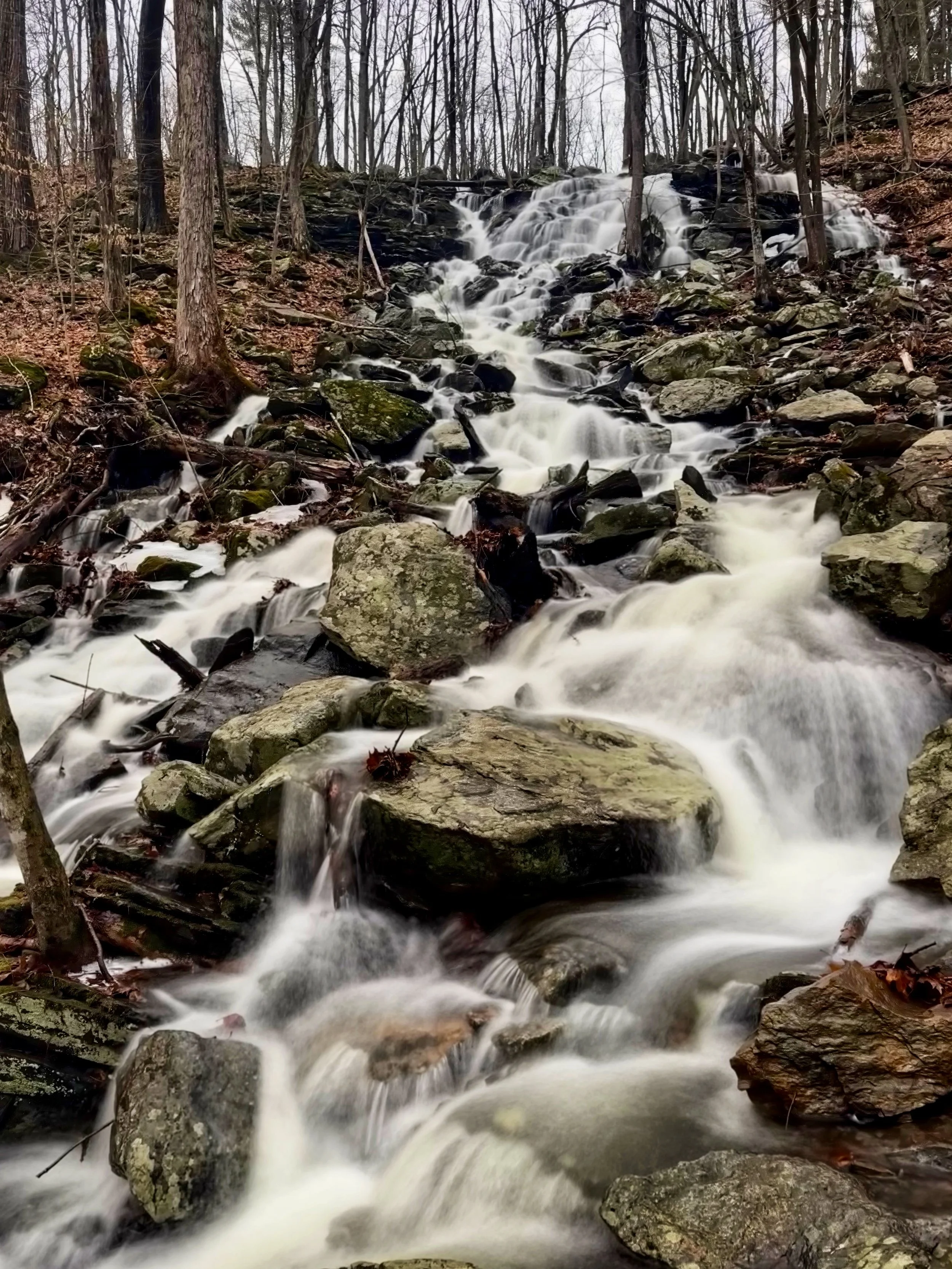 A view of Cascading Waters in Worcester, Massachusetts flowing strong after the snow melt.