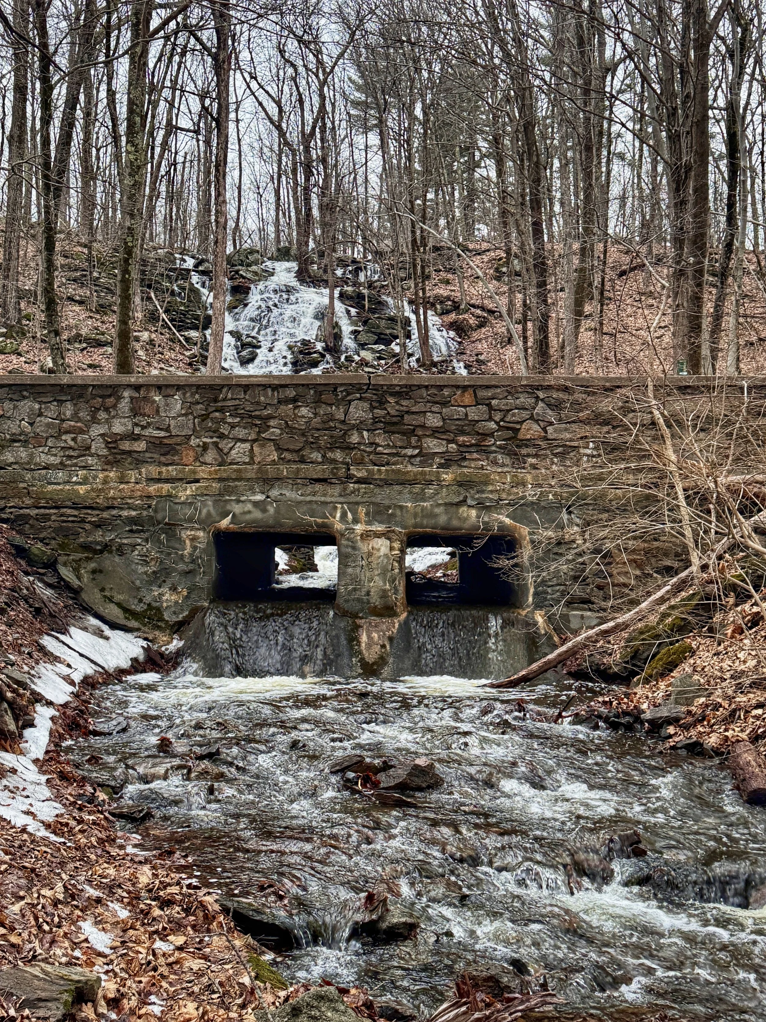 The main attraction in this section of The Cascades is the waterfall that flows strongest in April and May. You can get a great view walking just a few steps to the sides of the stone wall where the falls flows under continuing along the brook.