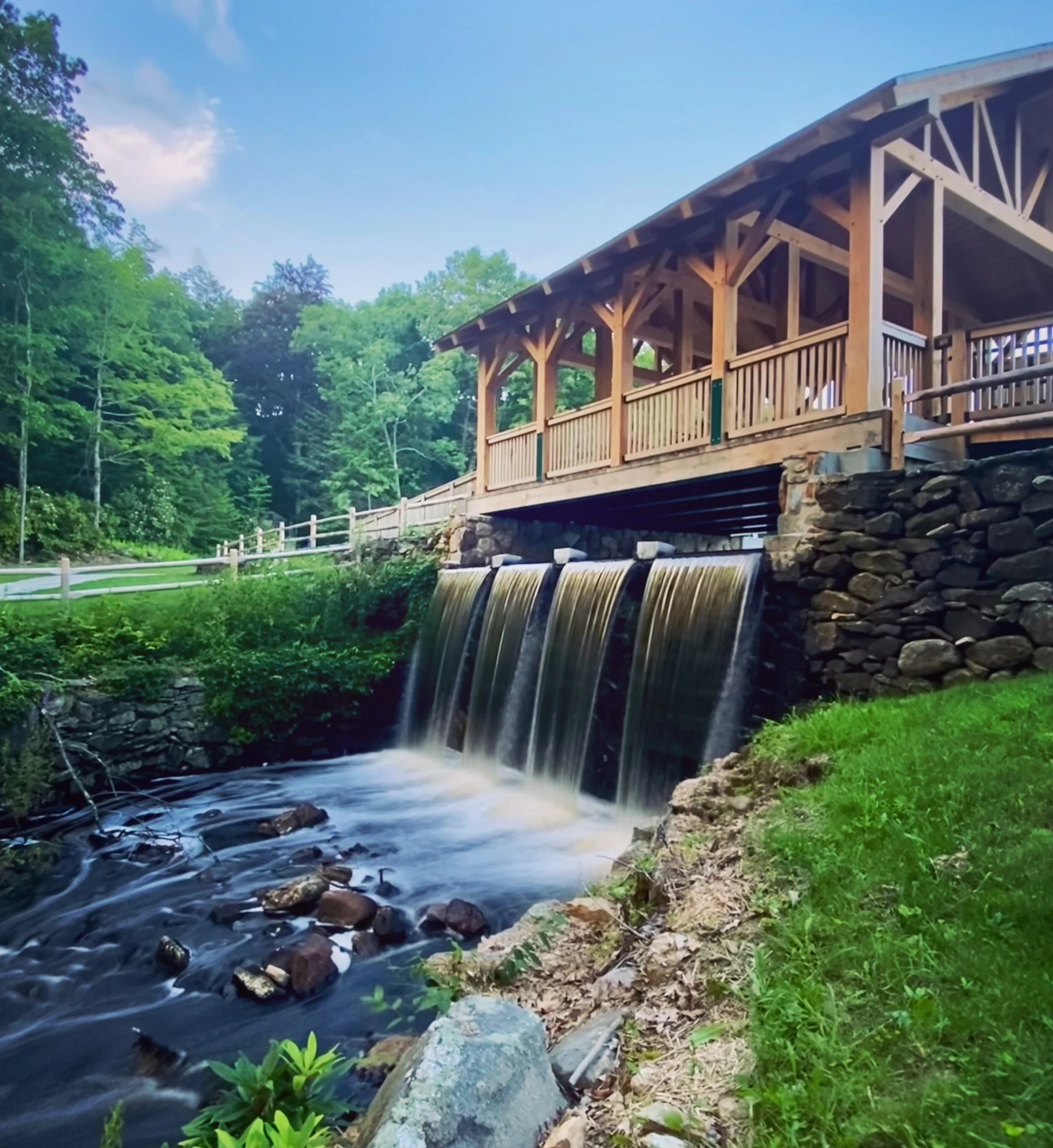 At the base of the barn is the first of two small waterfalls, which are part of the preserved sawmill property. Follow this waterfall back onto the paved path, which slopes down to the mill building. Along the way to your left, there is another waterfall and then – at the sawmill building – a third waterfall. Walk onto the small bridge for 180-degree views of the waterfalls and mill building.