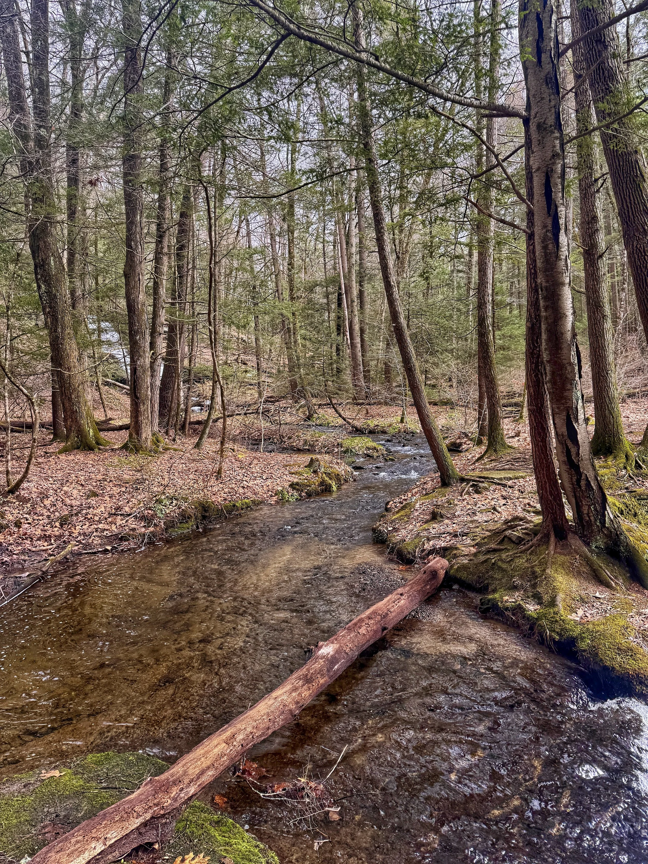 After parking, hike straight into the thick forest, listen for the rushing water sound and start heading down gradually at about 11 o’clock until you reach and cross a shallow stream. On my most recent visit in April 2025, the hiking trail is not obvious so follow the rushing water sound, and you’ll see the stream and upper falls in the distance.